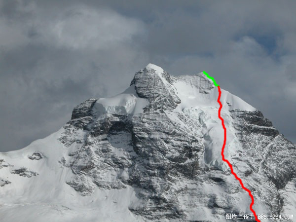 (因为天气的缘故,自己没有拍到路线的远观图片,只能盗用了何浪从8264下到的一张,原作者如有意见请联系。红色为我们完成的部分,绿色为最后的山脊。由于拍摄角度的关系,路线看上去要比实际的陡得多。)