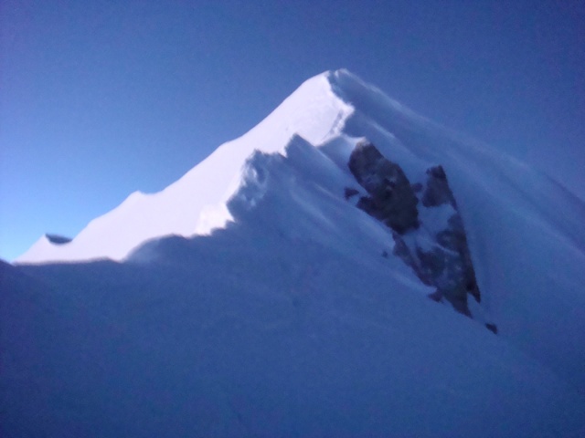 最后的结果是作为商业队客户登顶了所谓的“希夏邦马中央峰”,其实那并不是一座顶峰,而是距离顶峰还有一段距离的山脊平台处。据说海拔有8012米,离8027的顶峰只有15米的高差。实际看起来,似乎距离要远一些: