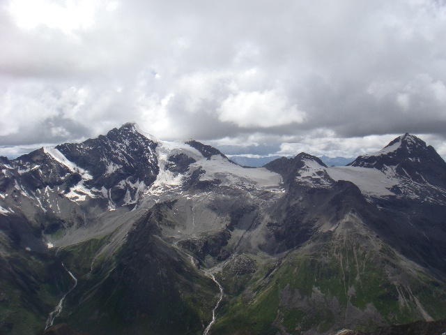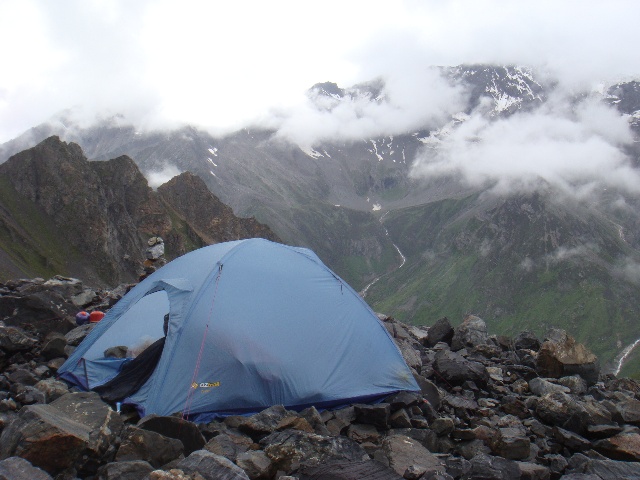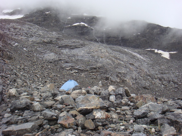 雨不知从什么时候开始飘下来,起初只有一点点,渐渐大了起来。下午4点一刻,我们爬升到碎石坡上海拔约4600米处,用石块铺出一片平整的地面作为营地,搭起帐篷在里面躲雨。我们做晚饭的时候,上面的雾散开了一小会,露出冰川的形状,我们才知道原来走偏了一条岔沟——不然第二天可能就会继续沿碎石坡朝东上升,彻底错过通往主峰的路线。