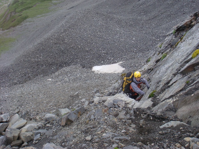 (爬升到山脊之前是一段碎石坡,顶端有很小一段岩壁。)