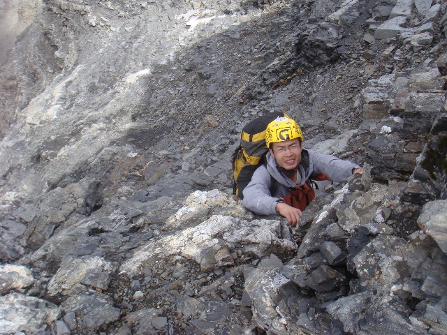 (离营地还有不到100米高差,刚刚进行了一段横切之后的岩壁。这个岩石边缘下面被挡住的就是路线上最难的一段,估计有5.6左右,不过长度只有3-4米。)