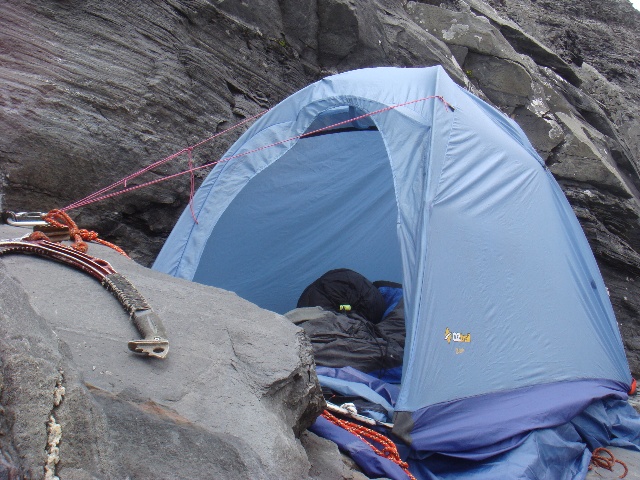 (帐篷,由于底下的岩板是斜的,并且宽度只有帐篷的2/3左右,睡觉时要把安全带连接到上角的岩锥,以免滑下去。)