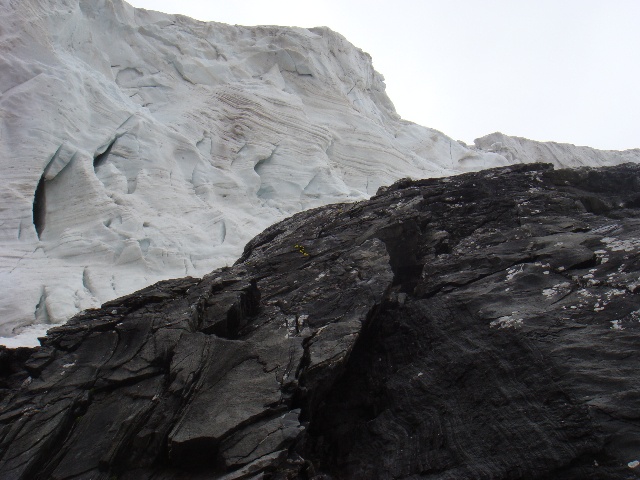 (帐篷紧靠的岩壁往上就是冰舌。)