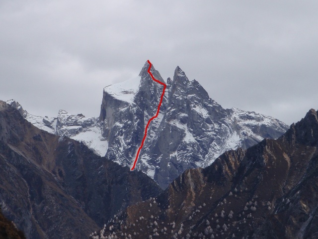 目标山峰迟布峰位于双桥沟与长坪沟之间,倒沟山以南,婆缪峰以北,海拔地图上标为5450,Climb杂志给出的海拔则是5466(倒沟山的海拔),可能后者有误。2005年秋,加拿大女登山者Katherine Fraser、Katy Holm和Aidan Oloman从东壁完成首登,一日内攀爬了14段持续5.9-5.10+的路线。我们此次的目标则是在西侧尝试新路线,最有可能是下图中的红色路线,难度主要存在于接近顶峰一段。