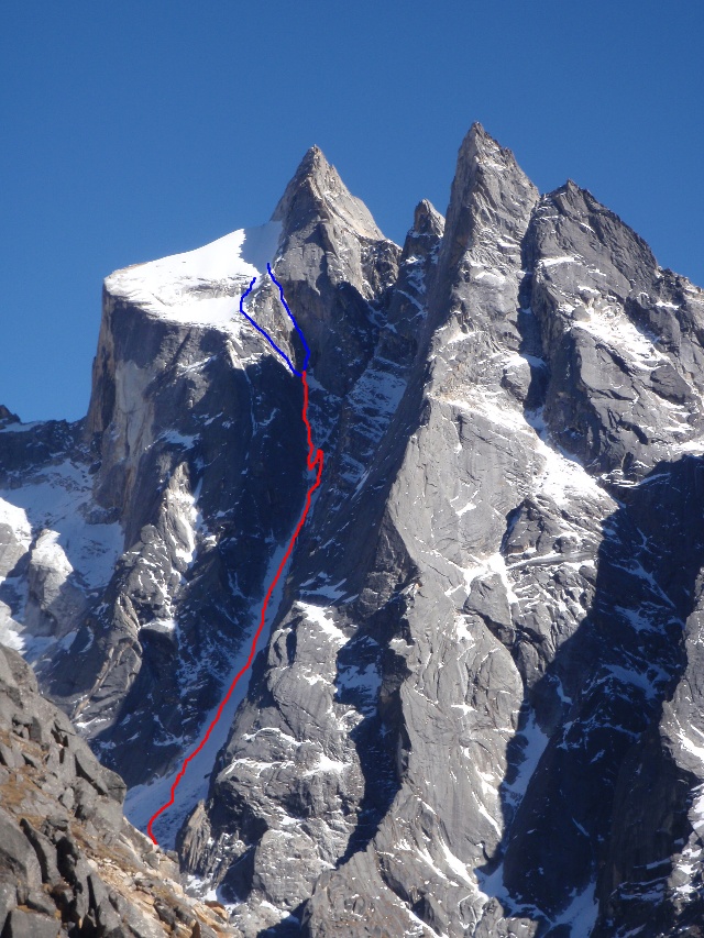 (我们此次尝试的路线,红色为完成部分,蓝色为左岔雪槽末端两条岩槽的延伸,都可以到达半圆形雪台上,但是从雪台到顶峰之间的路线情况依然是未知数。)