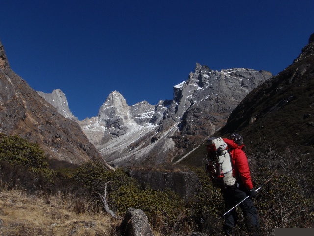 天亮(大概7:40左右)出发,负重并不轻:两个人各自的睡袋,一条双人露营袋,60米攀登绳,60米7毫米下降绳,岩石和冰雪保护器材,一天一夜的食品燃料和当天的饮水,加起来每个人的负重都在10公斤左右。