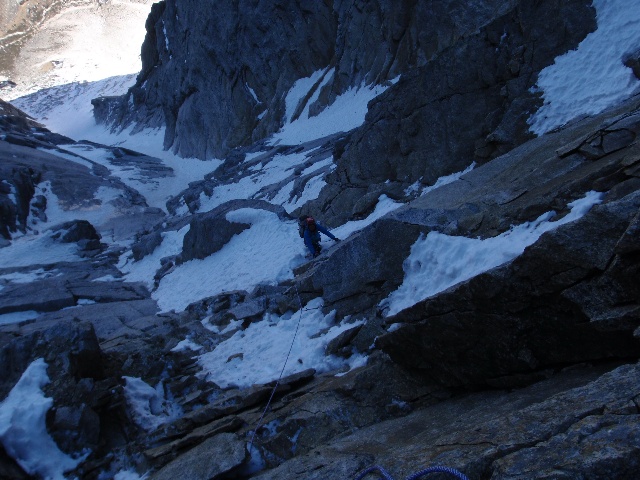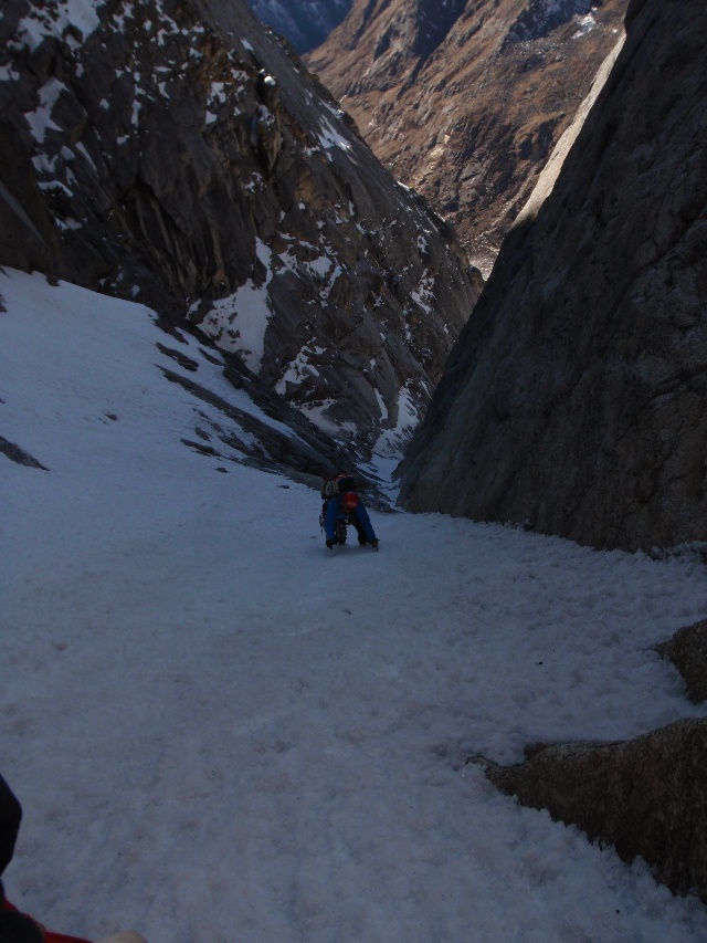 (沿雪槽下降的第一段,因为再往下一点点就是冰阶,所以下降会比倒攀快&安全。)