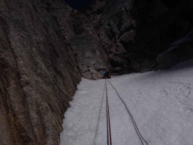 把攀登绳抽上来,再把绳头扔下去给李兰,她把理好的7毫米下降绳系在上面,然后我再把绳头抽回来,用挂在岩石上的绳套进行双绳下降,沿途把放置的塞子拆掉。降进左侧雪槽里已经是中午1点多了,从这里还看不到雪槽尽头的岩石地形。我们穿上冰爪,继续向上进行无保护的攀登。
