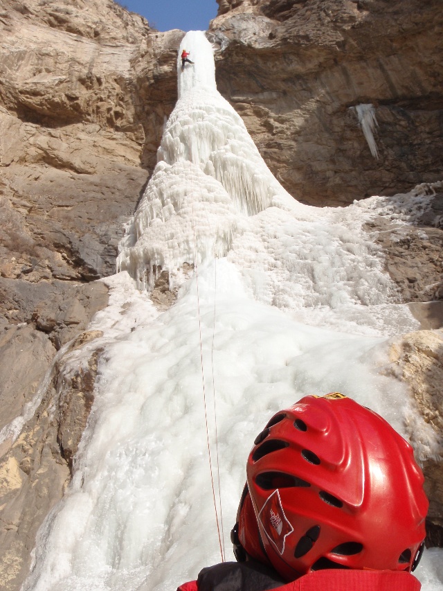 周六本打算去干沟,那里公路边有一条前一周上海的包子他们去爬过的冰,但是到我们去的时候冰已经塌了。于是改去沙图沟,那里外面是一处景区,沿冰河边的小路上溯到冰壁要40分钟。冰壁不大,WI3,总高估计有一整段,挂了下半段的顶绳爬了一天。这是我这个冰季第一次爬水冰,冰比较脆,不过攀爬的感觉比去年好不少,现在对于3的冰还是基本能稳拿的。