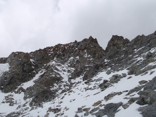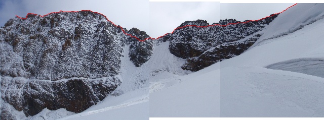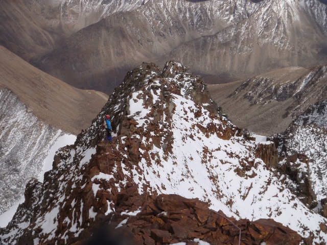 具体时间大约是9:20出发,11:30左右到达山脊上冰雪与岩石交界处,12:30左右到达中间的鞍部,16:40左右登顶,20:00左右回到接近中间鞍部的地方决定由此直接下撤,21:00左右沿流雪槽(这一天基本没有下雪,所以没有新的流雪危险,早上是因为惧怕流雪而绕远走山脊)撤到背隙,22:10左右回到营地。