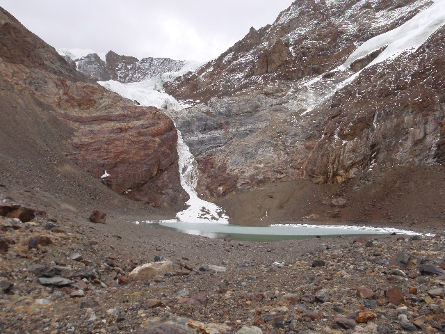(小湖和冰川融水形成的冰瀑,在夏季估计会是飞流直下的瀑布。此次我们并没有尝试从冰瀑直上,而是绕了旁边的碎石坡,不过对于时间充足、适应良好的队伍,这里应该是不错的训练场地。)