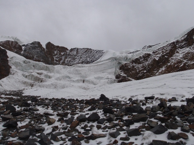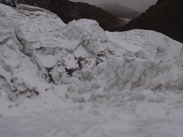 从左侧的碎石坡绕上冰川,即不必通过任何技术地形,最佳路线应该是不到冰川湖旁边,而在之前山谷中一片较开阔的空地(约5100米)处就一直沿偏左侧的山脊行进,起初是草坡,上有牲畜踩出的小径,之后逐渐过渡为碎石坡。末端冰川高约5500米,而向左通往东雄峰、向右通往另一座山头的冰川汇集区则高约5700米,中间要通过较为破碎的冰川地形。我们此次因为积雪很少,所以全程solo,如果雪太厚掩盖了冰裂缝则有可能需要用绳索结组。