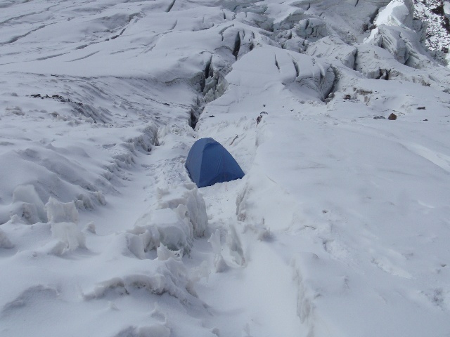 由于计划安排不合理,没有足够的适应,我们花了8个小时才从7日的4700米临时营地上升到从8日开始一直使用的5700米冰川营地,而9日也没能直接出发冲顶,而是在营地休整一天,我在上午往外走了一小段,去观察东雄的路线,结果上去要花一个半小时的路程,下来只花了20多分钟。