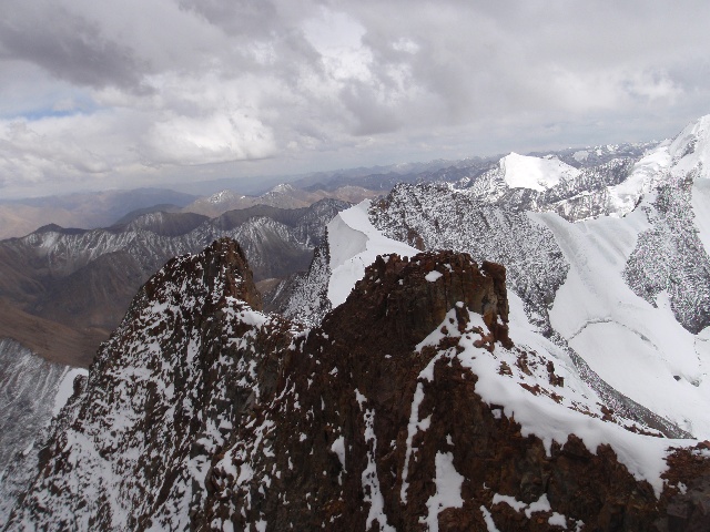 (在顶峰,实测海拔6095米[手表气压计]。背景靠右的岩石山脊尽头就是原本打算尝试却没去搞的那个山头,被挡住了。)