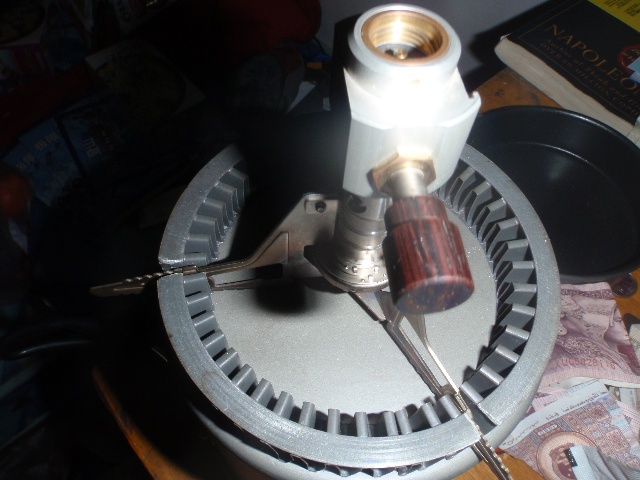 由于TiLite炉头的火苗较宽,距离锅底较远,所以在火头开到最大时有一定的侧漏。用钳子把集热片下面的铝圈钳出三个缺口,就可以让炉头的三个支片卡在里面。杯具的是我手工太差,钳第三个缺口时没对准角度,所以不得不在旁边再弄一个缺口,这样就牺牲了一点点集热片面积。