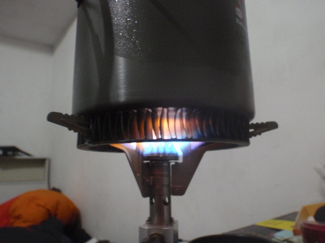 将炉头的三个支脚嵌进缺口,就基本不会再有火苗溢出的问题了,可以最大限度地利用TiLite的4200W功率。可惜只凭一把钳子和我贫乏的想象(登山真的会让人变蠢的!)没法设计出能像JetBoil经典版一样,让锅和炉头彼此锁定的方案。