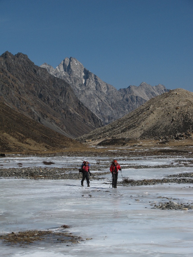 从嘉子下面的大本营上升到勒多曼因北侧冰川上的“前进营地”,途中要经过溪水漫溢形成的大片冰面。我们打趣说,下山的时候沿着冰滑下去应该很快。