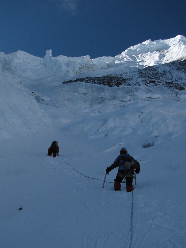 结组通过冰川的最后一段,过了喇叭口很快就到背隙。跨过背隙刚上冰川的一段是接近90度的直壁,Chris在这一段的优雅动作让我羡慕不已。