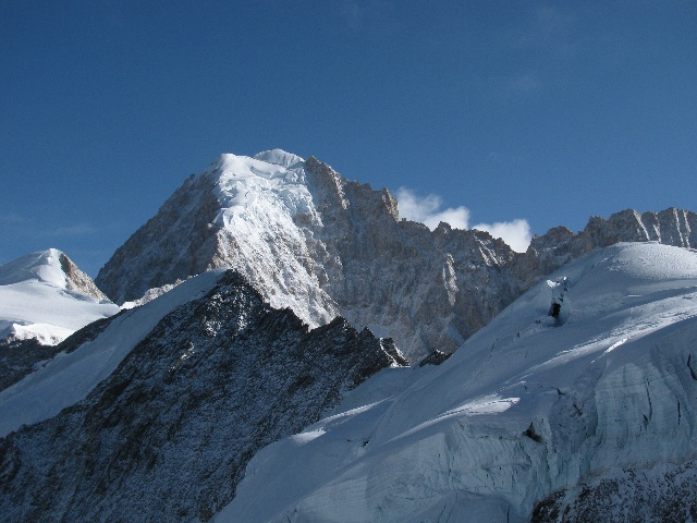 更近距离观察勒多曼因北壁上部,我们的路线是沿图片左下角的冰脊一路向上,实际上差一点点没有到岩石山脊部分。10月如果这条路线全部为硬雪覆盖的话,攀爬起来就容易&安全多了。