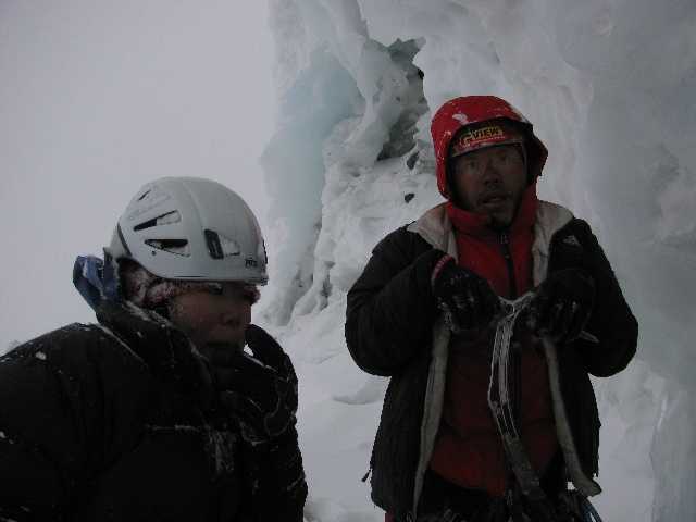 应该是为了拍照故意摆出的表情动作吧^_^Chris的手指后来冻出了水泡,我的也是,只有老布没事。这里就是我们到达的最高点了,当时应该离天黑还有两个来小时。