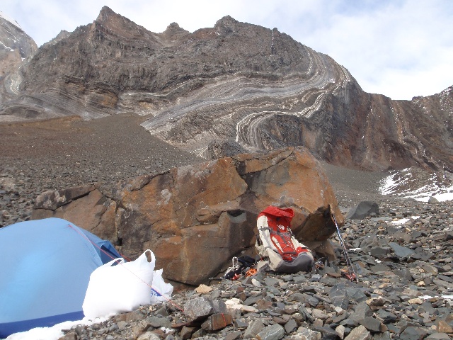果然,到晚上7点半天将黑的时候,我们只下完了7段绳距,刚刚到达花岗岩与沉积岩层交界位置下面一点点。我们就在这里沿褶皱带平台找了一条能放塞子的竖缝,背靠岩壁(这样可以躲避飞石,但却躲不开有可能会沿岩壁半滚半滑下来的大块石头,因为岩壁不是仰角)铺开露营袋。因为只带了一罐燃气,所余已经不多,并且我的水袋和李兰的水瓶都还有半升以上的水,所以晚上就没有动火,只就着水吃了点干果、鱼片、巧克力之类。不过,这一夜我们把露营袋上面拉高,半当成帐篷来用,并且身下的平台也比前一夜的更平一些,所以反倒过得比前一夜舒服。