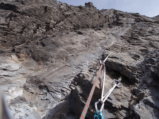 于是改向右沿褶皱条纹继续斜切,因为我们离开碎石坡上到岩壁的位置几乎是在整个山体的正中,而目标东南沟槽则相当偏右侧,向右肯定没错。石灰岩褶皱的坡度并不陡,但是很难找到适合设置保护点的岩石结构,爬到第3段绳距的时候将近一整段都无法设置中途保护点,最后终于找到一道竖缝放了个机械塞,结果又往上爬了两三米,李兰就喊“绳子到了!”原来我几乎相当于solo了一整段绳距。好在之后的几段绳距都不难,每隔二三十米放置一个保护点也尽够了。如果我们对彼此的攀爬风格和心理更熟悉一些的话,在这一部分完全可以采用行进间保护的。这一过程中上方发生了几次落石,大大小小的石块带着飕飕声从高处飞下,不过击中岩壁的位置都在几十米开外,并没有影响到我们。