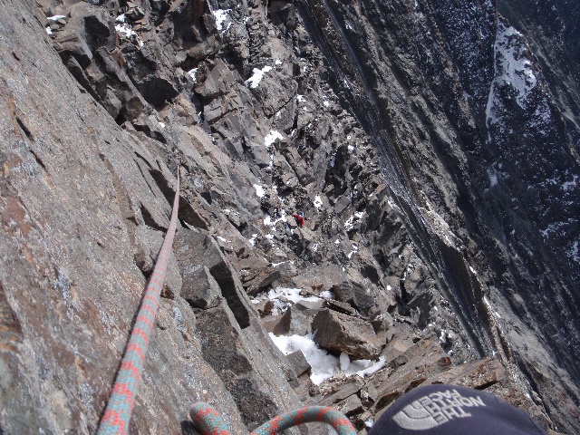 接下来沿山脊开始攀爬第6段绳距,这也是整条路线的难点所在:先沿脊线攀爬破碎的岩石,向上十几米后先向右转,通过一处非常暴露、需要在深渊上方重心外倾的横切地段,然后又是十几米稍带仰角的直壁,最后则回到脊线继续攀爬破碎的岩石。由于我从前一天起就一直领攀,这时的心理处于巅峰状态,所以这一段爬得酣畅淋漓。李兰上来后说这一段给个5.10并不过分,但后来我们考虑到穿高山靴负重(虽然负重量不大)进行高海拔攀爬造成的感觉影响,还是决定把这一段定成5.9+,这也是路线定级中难度数字的来历。至于总体投入度定成V,则是综合考虑了暴露感、落石威胁、持续难度和天气(尽管南壁向阳,但白天几乎一直刮风)之后的结论。