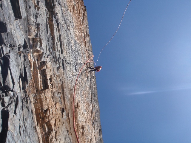 下完第一段绳距就遇到了麻烦,绳子不知什么地方卡住了,怎么都抽不动,最后李兰推抓结上攀回去,才把绕在两个岩角之间的绳子重新理顺。她在上升的时候,不知哪里飞过来一块石头,完全没有任何预兆,直直打在我的左侧眼角,造成了一道两厘米左右的伤口,流了些血。当时的第一个念头是“这下只好换太阳镜了”(由于路线上几乎完全没有冰雪,我们并没有戴太阳镜攀爬,而我背包里的太阳镜跟被石头打掉的眼镜一样是有度数的),结果居然在面前的背包底下找回了眼镜,并且镜架完全没有一点变形。