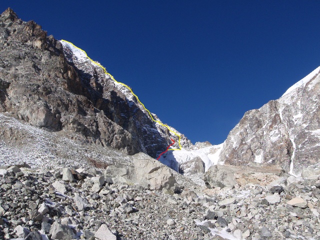 Day 2 (11月23日周二):一夜无眠,不知道是不是满月的关系...早晨4点起床,5:30出发;天亮时分(约6:40)到达田海子与白海子中间垭口南侧的冰川脚下约5000米处,穿好冰爪;沿右侧雪槽上升几十米后发现雪况不稳定,改由左侧冰川的左边缘上升;一路沿冰川与岩壁贴合处行进,雪厚而软,深处没腰,4个小时才上升到约5300米;由此向右上方攀爬两段绳距,第一段横切,第二段转上侧脊,均由古古领攀;第二段绳距尽头是一面headwall,总体呈仰角,右边尽管有缺口可能可以翻出去,但破碎岩石的威胁十分严重,衡量时间及身体状况意识到day-push已不可能成功,决定放弃;下降两段(第二段途中引发了小规模雪崩)后小心通过雪盆,回到之前的脚印上,原路撤回营地,时间为16:30。花了11个小时只从4800的营地往返不到5400米高度处。