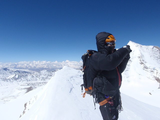 (周鹏在标称海拔6902米的古纳峰顶,背景中右侧的山峰为纳木那尼。)