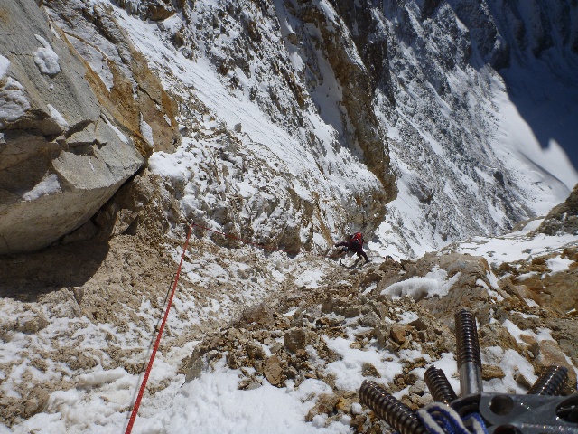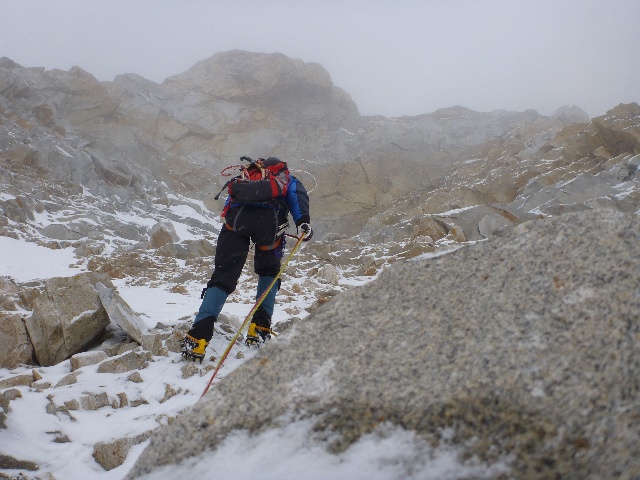 我们从顶峰开始下降(这里还留着韩国人插下的雪锥),12段绳距刚好下到起步的雪槽位置,居然跟嘉子峰南壁的长度一模一样。天气不好也不是没有好处:降下的新雪把松动的石块糊在了山壁上,所以我们在下撤过程中基本没有遇到自发的落石。回到5300米的营地已经将近17:00,等到我们收拾好东西背着沉重的包开始往下走,离天黑已经只有一个多小时了。黑夜里在大块松动的花岗岩冰碛间穿行并不是好玩的事情,还好我们迷路迷得不太厉害,大约23:10回到了大本营,赶在11月到来之前结束了这次攀登。