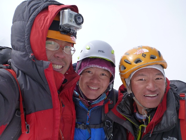 李爽随身揣着小摄像机,在每一段的保护站都拍一拍,但是镜头都很短,因为小摄像机的电池太不稳定,尤其是到傍晚太阳开始西沉,为天边云层所遮挡的时候。等到我们终于翻上通往顶峰的最后一段雪脊,天已经完全黑下来了,幸好顶峰的巨石底下有一片足够宽敞的平台,我们可以把帐篷搭起来过夜。韩国人在这里丢弃了一整捆路绳,可惜半冻在冰里,没法拿进帐篷当垫子用——不过也没有必要,垫着绳子和背包,脚裹在睡袋里,尽管外面断断续续地下着雪,但我们这一夜过得已经可以勉强算上暖和了。