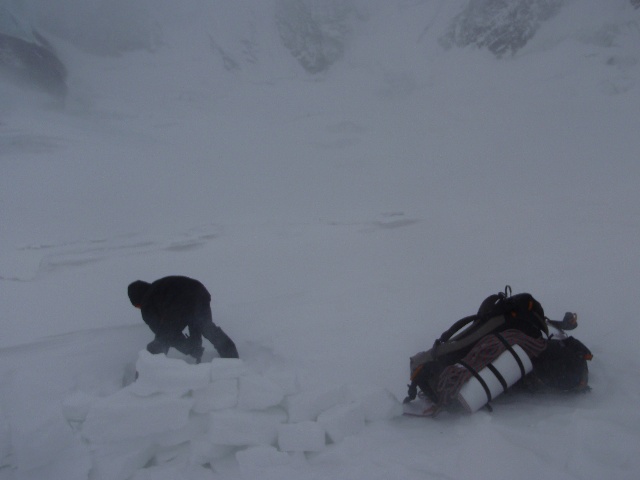 (在勒多曼因冰川营地修建雪墙,虽然修得很厚,最后还是被风吹塌了,或许是因为把帐篷防风绳固定到了墙根雪砖上的缘故吧)