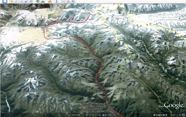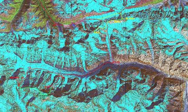 (更新在等高地形图上表示的路线:红色为徒步及攀登路线,绿色为未能完成的计划中路线,黄色为适应期的三次攀登尝试)