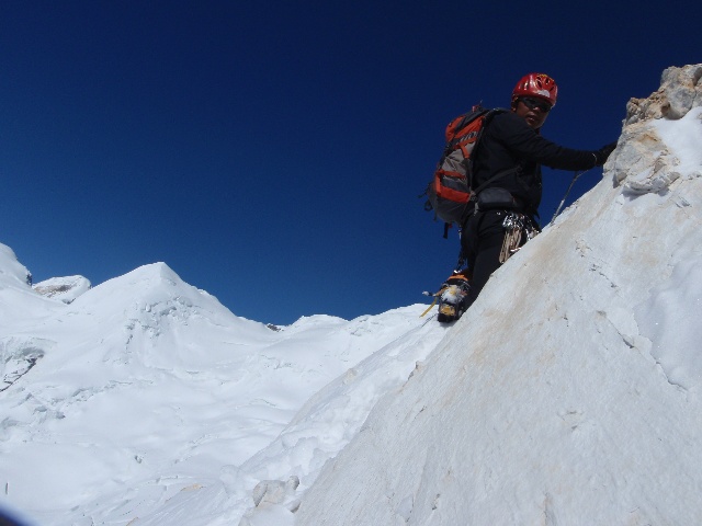 这场连续9天的“长征”,结果是从大本营出发的第4天,我们为陡峭松软、形状复杂的雪脊所阻,而旁侧的冰壁又频频雪崩,我们只得放弃却勒博斯主峰北壁支脊路线,沿主冰川继续向西寻找新的路线,却发现主峰西脊同样艰险漫长无法在食品物资允许的时间期限内搞定,而通往主峰西脊与西侧卫峰之间鞍部的冰川路线也为一条巨大的横向裂缝切断。就在几乎已经承认失败的时候,我们在从冰川下撤的途中发现西侧山壁可以一试,尽管上方有悬挂的雪檐,前一天晚上又有过大规模降雪,如果雪檐崩塌就十分危险,但我们还是决定赌一把,结果幸运地平安通过了危险区,次日(总第7天)登顶了海拔实测5863米的却勒博斯西北卫峰,第9天晚间终于回到大本营。这9天里我们攀登与负重徒步共计89个小时,往返路程(包括攀登路线与接近路线)共约114公里,回到大本营时,我和周鹏分别还剩下3块和4块话梅糖的路餐,其余所有食品全部耗尽。