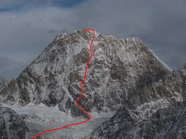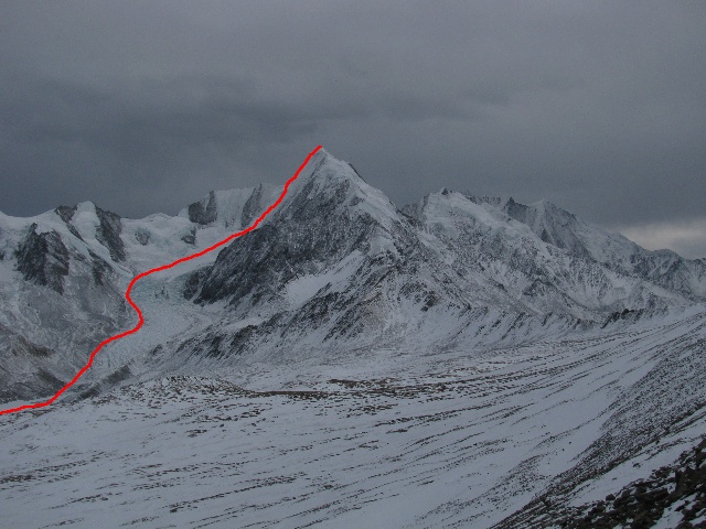 勒多曼因北壁的预定路线,即使只为了纪念Chris,这条路线也至少值得再去尝试,更何况勒多曼因是这片区域较高山峰中难度最低的,本来就是前中期适应性攀登的不二选择。相形之下,老布跟Kyle倒是搞了日乌且中央沟槽作为爱德加的热身与适应,不过连续20多个小时寒风中技术攀登与下降的结果就是过了将近两个星期才缓过来,而我们并没有这么长的时间,何况在小贡嘎、嘉子、日乌且这个半圈形里除日乌且中央沟槽之外也找不出什么相对不太极限的路线了。所以,就算勒多曼因北壁的雪况不适合攀登,我们很有可能也会搞一下西山脊作为适应。