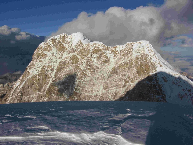 嘉子峰西壁的上半部分,老布与Kyle摄于日乌且峰顶。正中央云影右下的那片三角是法国人左右两侧都尝试过的那个buttress,云影左边往上延伸的雪槽则是我们此次预定路线上部的雪槽。从这个角度(日乌且海拔跟嘉子差不多)才能看出,从headwall下方斜槽切过来转进雪槽之后还有将近一半的高差要爬,而到达那个大雪包之后通往顶峰的刃脊也未必就很容易。