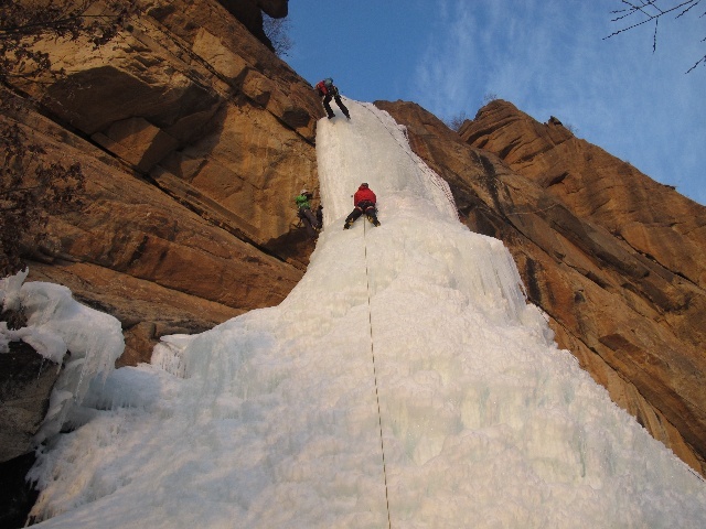 2012年元旦,我和周鹏、李爽、苏菲、石家庄户外爱好者“汗腾格里”一起在石家庄附近的中台山冰瀑攀冰。这是我们“Yes, Ice!”攀冰之旅抵达石家庄的第三天,前一天在嶂石岩景区攀爬过两处冰瀑(均为周鹏领攀),这一天由于发现中台山冰瀑的难度较低(总体大约WI3,下2/3左右是斜坡,上1/3接近直壁,冰质良好,较为柔软容易打镐,总高大约23-24米),我们决定把这里作为随便爬爬玩和练习拍摄视频的场所。