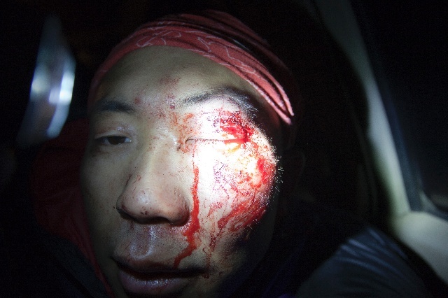 后来李爽拍摄的视频(第一段记录在下午4:58,长度16秒)已经反映我摔落在冰壁底下,苏菲(以及很快下来的周鹏)在查看情况。唯一的冰锥在受力时失效了,导致我一直落到冰壁最底下(总高度大约20米左右),幸运的是我只是撞在冰壁斜坡部分的中上段之后半滑半滚落下去,虽然后来头盔内部的泡沫缓冲材料在左前额部位的裂纹说明还是撞到了头,但除了可能因撞击造成轻度脑损伤之外并没有什么特别严重的损伤。撞击的确让我晕了一小段时间,在之后的两三天里颇为嗜睡,到1月4日也就是3天后才基本恢复清醒,而各项意识能力逐渐重新“激活”则是从5日开始、一直到现在都不好说有没有彻底完成的过程。左眼左侧和上眼皮的划伤(或许是被破裂的眼镜片划的)与肿胀让我的左眼暂时无法视物,在石家庄的医院粘合处理伤口后在几天内消肿,目前基本完全恢复,只是左侧眼白的小块淤血还没有彻底消退。大约过了几分钟,我开始能够说话和活动身体,后来在李爽从冰壁上撤下、周鹏收掉绳子和顶端保护站之后,我似乎是基本靠自己走回到停车位置,被运送回石家庄接受处理,尽管这一过程我现在完全回忆不起来,直到医生开始粘合伤口才开始有断断续续的记忆。