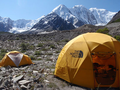 等到我们垂头丧气地撤下冰川,回到23日的营地,已经是傍晚8点多了,距离早晨出发已过了12个小时,而我们的感觉更像是经过了好几天的攀登那样疲惫不堪。筹划酝酿了这么久的攀登尝试就这样宣告失败,那种失落感实在令人无处发泄。这时我脑海里转过一个念头:尽管目标路线没能搞定,但我们还剩下足以维持三四天的食品,完全可以沿着喀拉古勒冰川继续西进,观察一下却勒博斯主峰西北侧的两三条山脊是个什么样子,如果简单到可以快速攀登就尝试一下,就算不行,至少也可以作为下次再来尝试的参考。周鹏也觉得应该再往上走走看,于是在这天夜晚我们进入梦乡时,心头的失落或多或少已经被新的探索憧憬取代了。