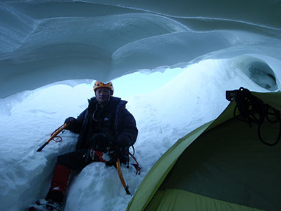 侧脊上岩石嶙峋,我们的上升路线是岩石中间的碎石沟槽,碎石每踩一脚都会向下滑,背包又重,向上攀登成了一桩相当痛苦的事。上升了几百米后,我们的行进方向渐渐分开:周鹏偏左,这样可以直接上到脊线上的更高位置,我则直上略偏右,因为这样上到脊线的距离较短,我觉得之后再沿脊线上行会更容易些。结果到达脊线之后,我才发现继续上行并不容易,需要在深雪中沿着陡峭的山脊侧壁斜切,并且沿途还有三处陡峭到几近垂直的台阶需要通过,每一次都要从松冰翻到软雪上,背着这么重的包无保护进行这样的攀爬,令人心里发毛。还好雪尽管深达没膝,稳定性却很好,一直都没有发生雪崩。刚翻过第三处台阶,我就听到周鹏在呼喊,原来他早已经上到了脊线,建好了营地,又空身下来接应。我踩着他的脚印来到营地,发现帐篷搭在了一处仰角悬冰川下方的空腔里,完全不必担心上方的雪崩或是夜里可能发作的风雪。营地实测海拔4861米,从早晨出发到抵达,我足足花了12个小时。