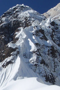 呈现在我们眼前的是令人丧气的一幕:前方的一两百米山脊不仅极陡,而且雪檐与悬冰犬牙交错,任何一处陡峭的地方如果是松雪,都会令我们陷入进退维谷的境地。就算能侥幸通过这一段,也必然会耗上相当长的时间,而再往上必须要再爬上几百米冰雪岩混合的陡峭地形,才能到达可以扎营的雪盆。方才在积雪中的痛苦挣扎让我们明白,这样的侥幸几乎不可能发生,因为只消连续几米陡而松的雪坡,就能让我们寸步难行。我们把目光投向侧脊的左侧,那里有一条冰带从雪盆直挂下来,如果撤回侧脊基部再沿冰带攀爬上去,或许可以从左侧上到雪盆。