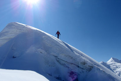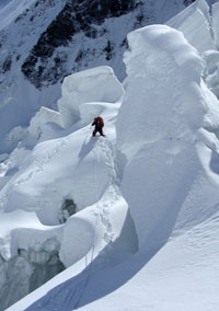 我以为自己一定会沿着脚印往下走了,然而到达分岔点的时候,我却不由自主地朝上迈出了步子。一步,又一步,又一步...从这里可以往右边横切了,通过一段陡雪坡就可以到达侧壁脚下...向上,保持节奏,雪檐已经在头顶正上方了,快速通过!我能感觉到自己一下子兴奋起来,之前的犹豫和顾虑全都被从心底里涌起的兴奋淹没了。保持迈步节奏与呼吸节奏协调一致,动作要干净利落,但又不能操之过急,让身体持续发挥尽量大的功率...我用不着有意识地提醒自己,因为这些早已经在一次次的攀登中成为本能了。不知不觉间,我已经跨越了背隙,开始偏向左方。周鹏因为有充分的前期适应,一路上状态都比我要好,越过背隙之后不久就超到了前面开路。