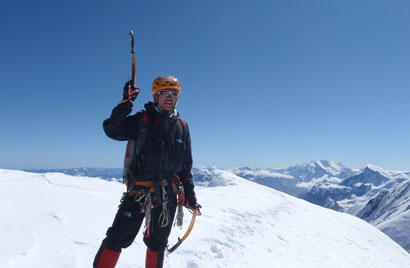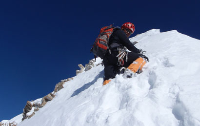 28日是离开大本营的第七天,我们9点左右离开营地,朝着卫峰方向进发。晴朗的蓝天上没有一丝云彩,并且因为前一天夜里没有下雪,山脊横切路段的雪硬化得恰到好处,冰爪踩上去只会陷进去一点点,既节省体力又有安全感。冲顶最后一段的脊线上,积雪要更松一些,不时有奇形怪状的黄白色石灰岩从雪层里支棱出来。最后我们终于踏上了卫峰顶,时间是上午11点42分。