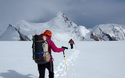 由于骑马进山节约了体力,我和周鹏只休整了一天时间,22日一早就从大本营出发了。我们计划花两天时间抵达目标支山脊基部,四天攀爬路线,两天下撤。食品按照八天七夜准备,早餐和路餐适当少一些,因为按照以往的经验,多日攀登如果严格按天数来计划早餐和路餐,最后必然会有剩余,相当于平白增加了一路的负重。燃料方面,从大本营带了两个450克大气罐,加上之前存在过渡营地的一个,足可以撑到十天以上,因为一旦攀登周期被迫延长,缺少食品还可以忍耐,但在雪线以上没有燃料就意味着没有饮用水。