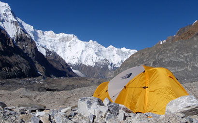 我们花了两天时间牵马徒步40来公里进山,因为最初的临时营地近旁没有干净水源,又花了一天分四次把装备物资向上背了一小段。明黄色的TNF半球帐篷往乱石滩上一搭,大本营就显得有模有样了。建好营地的第二天,李兰就出乎我们意料提前抵达了大本营,原来她找到了跟我们一起进来的马工,骑马进来只花了多半天时间。