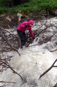 反常天气还在持续,海拔只有2900米的大本营下了一夜的雪,这是我们一个月攀登周期里唯一一次大本营下雪。不过第二天也就是7月15日,我们还是决定徒步出山,到伊宁跟周鹏会合,休整一两天再进山展开正式的攀登。出山路相当艰苦,不仅积雪湿滑,并且沿途需要趟过的两条河也变得湍急汹涌,李兰在过第一条河的时候被冲走了一段,赵兴政也被冲丢了一支登山杖。第二条河的河道更窄,水流更深更急,还好我们在上游发现了一棵被伐倒的松树,横跨在河面上作为独木桥,尽管水流已经漫过了部分桥面,还是能够安全通过。最后我们到凌晨1点钟也没能走出沟口,只得在临近沟口一支地质勘探队的大帐篷里借宿。