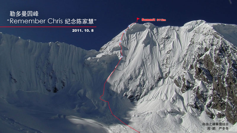 2011年10月8日,我与周鹏搭档沿北壁登顶勒多曼因,我们的路线“纪念Chris”(AI2/55度雪坡,1000米)应为首条沿北壁到达顶峰的路线。之所以这样给路线命名,是因为Chris在那次攀登勒多曼因(尽管只是她的第二次高海拔登山,并且又遇上了恶劣的天气条件,但她一直保持着温润平和的心态,否则我们三人很难全身而退)之后不久的6月,在美国本土单人无保护攀爬Eichorn塔峰时不幸坠落遇难。我们早晨6:47出发,15:42到达顶峰,之后沿西山脊下撤,周鹏和我分别于9日早晨6点多/7点多回到海拔4300米的上日乌且大本营。
