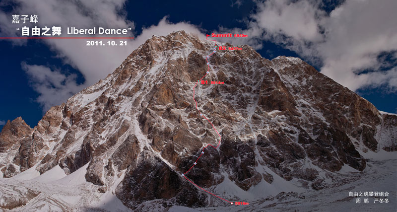 2011年10月19-21日,我与周鹏搭档完成了嘉子峰西壁中央路线,命名为“自由之舞”(M6/WI3/55度雪坡,1524米)。我们19日早6:30从西壁脚下5000米的营地出发,8:05到达西壁中央斜槽第一道右斜支槽的起点,开始穿上冰爪拿出绳索进行技术攀登,此处海拔5116米。当天除第二段绳距(M5,周鹏领攀)外全程行进间保护,路线为斜支槽-右侧主沟槽,天黑后不久(约19:40)到达路线中段岩壁根部5914米处挖掘平台露宿。20日上午9:30从露宿位置出发,向右上斜切绕过岩壁进入下一条主沟槽,继续往上攀登一段后往右翻上沟槽侧面的支脊,却发现支脊有百余米难度较大的岩石地形(最难至M6)而非连贯的雪脊,天黑后只得在支脊偏右侧一道支槽的顶部挖掘平台露宿,此处海拔6407米。当天除最后半段绳距外全程行进间保护。21日上午9:47从露宿位置出发,12:01登顶,之后沿南山脊下撤,南壁下降12段到达嘉子、日乌且、爱德加峰中间的雪盆上宿营。22日从嘉子与日乌且中间的垭口下降4段回到冰川上,下午回到上日乌且大本营。