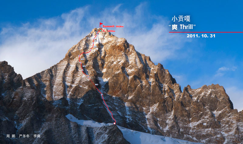 2011年10月31日,我与周鹏、李爽搭档沿南壁登顶小贡嘎,路线的上1/3与韩国人路线有部分交叉和重合,下2/3则是新路线,命名为“爽”(M6/50度雪坡,600米)。我们30日早晨6点从南壁脚下海拔约5300米的营地出发(由于是用手表测量加修正,无法确认准确海拔),在中央雪槽里行进间保护一段,雪槽往左的侧槽里行进间保护一段,之后除最后一段之外均为多段攀登、周鹏领攀。在海拔约5700米处发现遗留的白尼龙路绳与保护点,再往上一点发现印满韩文的能量胶包装袋,由此确定路绳为韩国人留下。之后的路线又与韩国人的交叉几次,接近顶峰(5850米以上)后基本重合。天黑后(约20:30)在顶峰下巨石底部的平台宿营。31日上午拔营出发,10:20登顶,之后由顶峰开始下降12段回到冰川上,拆掉营地于23:20左右撤回大本营。